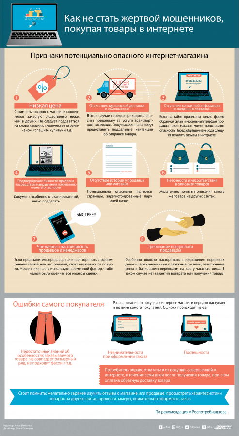 Ведомство рекомендует также внимательно выбирать интернет-магазины. Так, насторожить граждан должны цены, установленные ниже рыночных, обязательная предоплата товара, отсутствие возможной курьерской доставки и самовывоза, отсутствие контактной информации и сведений о продавце. Особенно настороженно надо отнестись к недавно открытым интернет-магазинам без «истории».
