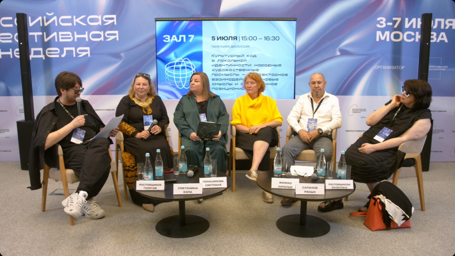 Деловая программа проходила в кластере МГУ «Ломоносов». К сожалению, провести время в этом чудесном здании мне удалось только в пятницу. Первым делом я посмотрел программу: среди лекций я нашел действительно интересную тему — «Культурный код в локальной идентичности: народные художественные промыслы — межсекторное взаимодействие, новые смыслы и современное позиционирование». На панельной дискуссии обсуждали использование народного искусства в оформлении мероприятий. Вначале спикеры продемонстрировали опыт взаимодействия с культурной айдентикой населения многих регионов страны. Мне, как коренному москвичу, было интересно узнать не только о хохломе и жостовских подносах, но и об уникальных ремеслах Тюменской области и Пермского края. Однако ознакомительная часть длилась недолго — она переросла в рассказ спикеров о мероприятиях в целом. На священном совете (с самим собой) было принято решение двигаться дальше.
