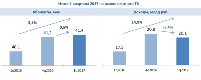 «Уже второй год подряд рынок платного ТВ демонстрирует спад в первом квартале: темпы роста абонентской базы замедлились, и приток новых абонентов уже не компенсирует сезонность в выручке спутниковых операторов», - отмечает «ТМТ Консалтинг».