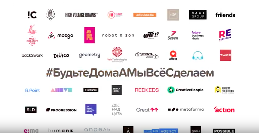 Ролик #БудьДомаАМыВсеСделаем был создан почти полсотней агентств. Они продвигают услуги друг друга и обращаются к своим клиентам, уверяя, что всё сделают за них, главное, чтобы они были дома.
