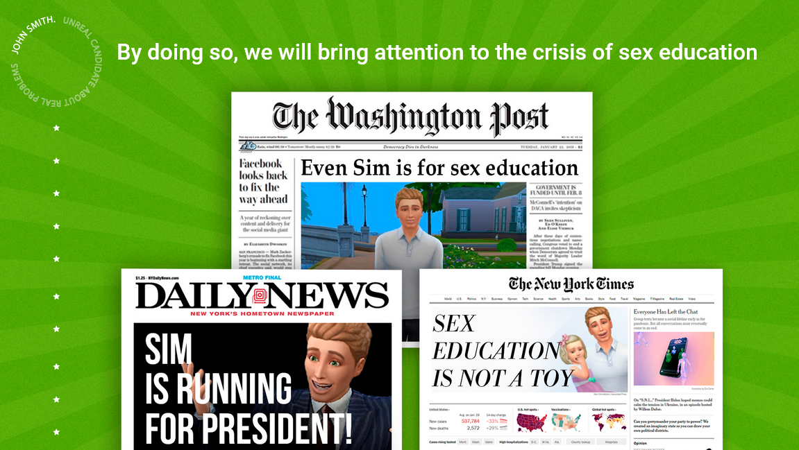 Первая работа, получившая золото, называлась «Сим кандидат». Задача брифа — с помощью игры Sims4 решить проблему сексуального образования у подростков.