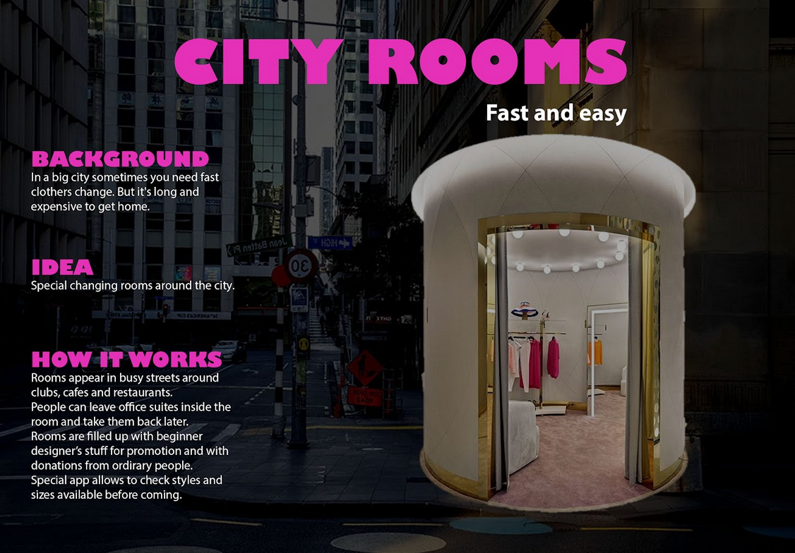 Дуэт студентов Mads за все время участия получил серебро и две бронзы. Особенно ребята отличились в последнем раунде, бриф которого — переосмыслить роль города для человека и бизнеса, когда мир становится все более диджитальным. Жюри наградили серебром проект City Rooms, его идея — специальные комнаты среди города для смены рабочей одежды на повседневную. Как рассказала Sostav Лисавета Мутина, изначально участницы и вовсе не хотели подавать эту работу, и даже не предполагали, что проект найдет отклик в сердцах профессионалов.