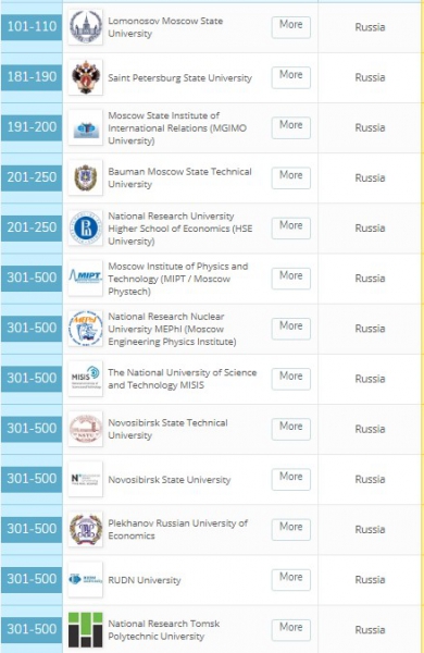 Лидером списка стал Московский государственный университет, который находится на 101 месте. На втором месте оказался Санкт-Петербургский государственный университет (181 место), а на третьей позиции — Московский государственный институт международных отношений (МГИМО), у него 191-е место в рейтинге.