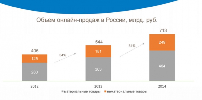 Объем рынка российской интернет-торговли составил 713 млрд рублей в 2014 году, из них 464 млрд пришлось на материальные товары. Рост по сравнению с 2013 годом составил 31%, подсчитала Ассоциация компаний интернет-торговли (АКИТ). Драйверами рынка стали увеличение интернет-аудитории в регионах и развитие мобильного интернета.