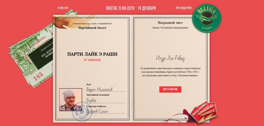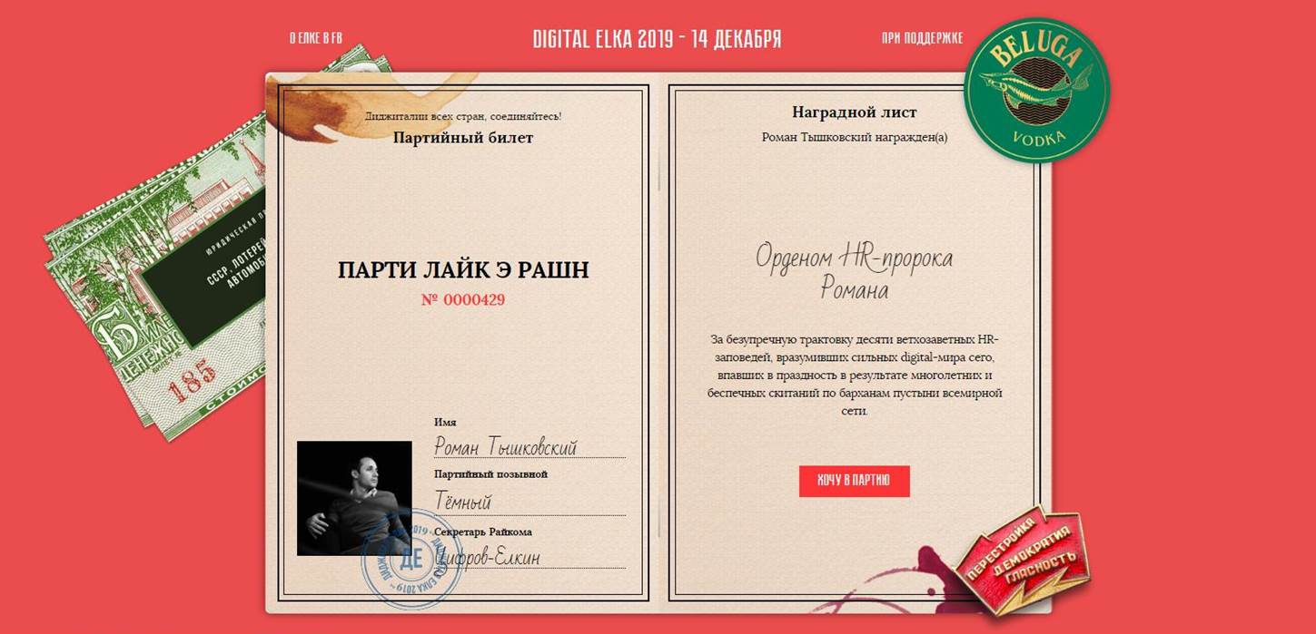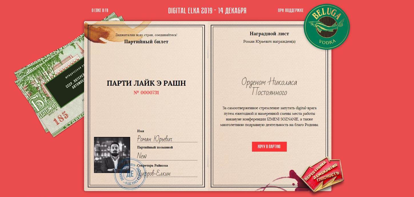 Электронный «партийный билет», который подтягивал данные со страниц пользователей, предлагал каждому новоявленному члену индустриальный псевдоним и одну из наград с описанием digital-заслуг. Это могла быть медаль за выступление перед бойцами самопровозглашенных республик CTR и СPC, Гран-при «Каннских льдов» за помощь детям африканских республик с целью получения призовых мест на международных фестивалях рекламы или орден за попытку отвоевать digital-бюджеты в неравном бою с рекламодателем, приведшую к смертной казни через проигрыш тендера. Всего более 35 вариантов.