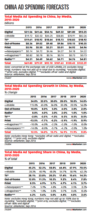 Медиарекламный рынок Китая занимает второе место по объему после США и составляет примерно $ 80 млрд., согласно данным eMarketer по состоянию на сентябрь 2016 года.