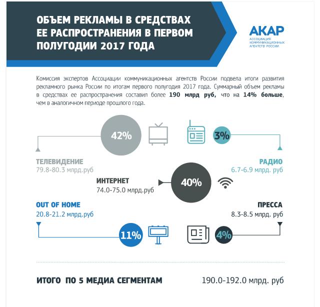 Согласно опубликованным накануне данным Ассоциации коммуникационных агентств России (АКАР), рекламный рынок России в первом полугодии 2017 года вырос на 14% до 190 млрд. рублей, что говорит о небольшом замедлении его темпов роста — в аналогичном периоде 2016 года динамика составляла +17%.