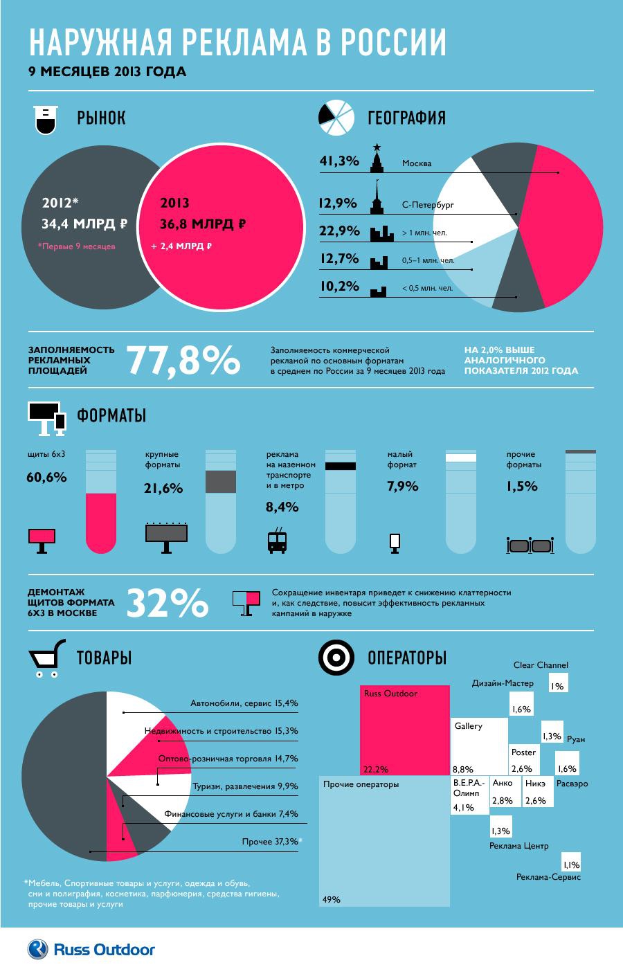 Москва снизила свою долю на рынке наружной рекламы. По итогам января–сентября 2013 года доля столичного региона уменьшилась на 3,7%, хотя он и остается крупнейшим в России с 41,3% в денежном выражении. Сокращение столичного outdoor-рынка связано с реализацией новой концепции размещения наружной рекламы и сезонными колебаниями в отрасли.