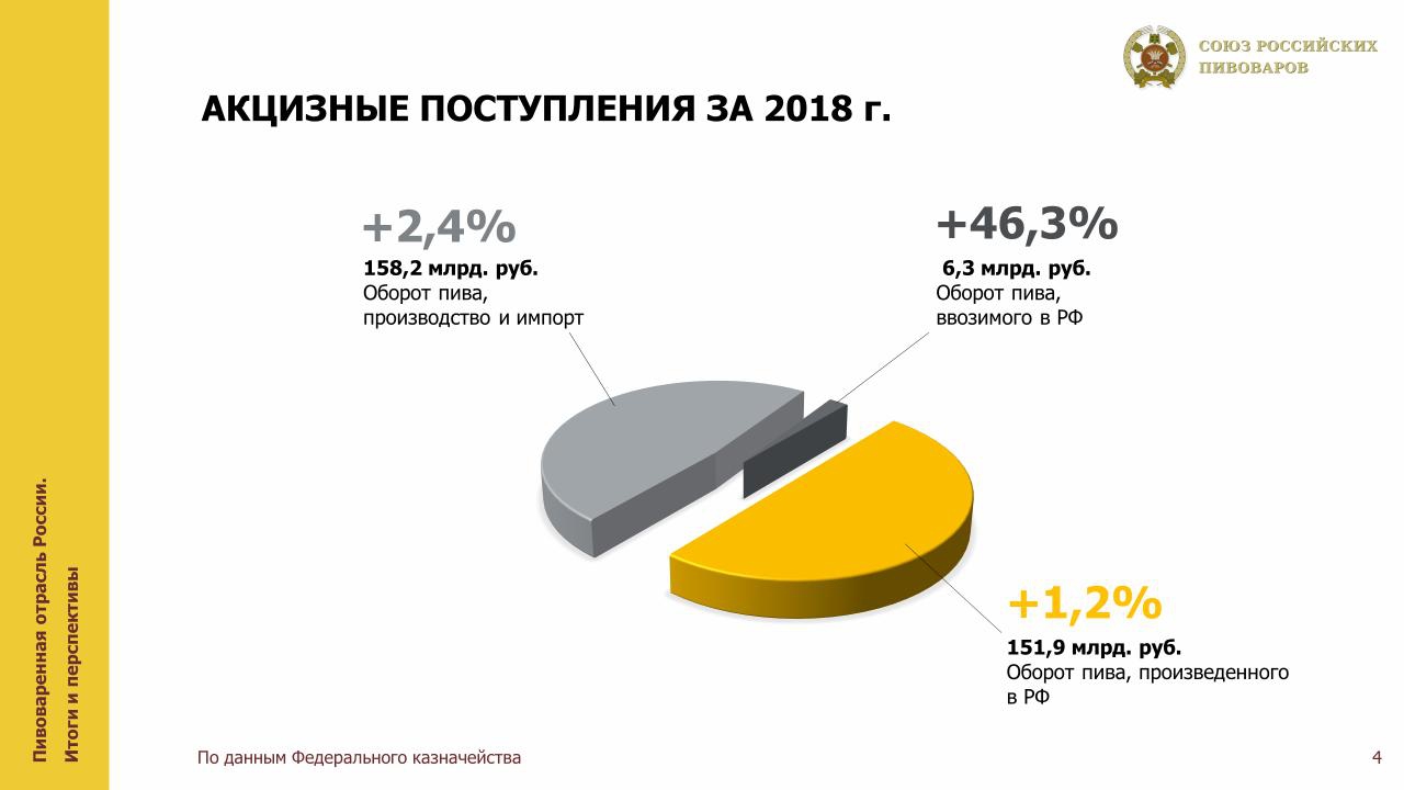 Отрасль традиционно показала высокий уровень налоговой дисциплины. По данным Федерального казначейства, в 2018 году акцизные отчисления пивоваренной отрасли увеличились на 2,4% и составили 158,2 млрд рублей.