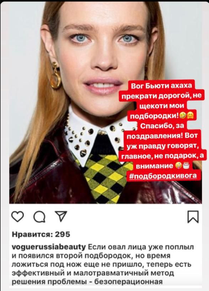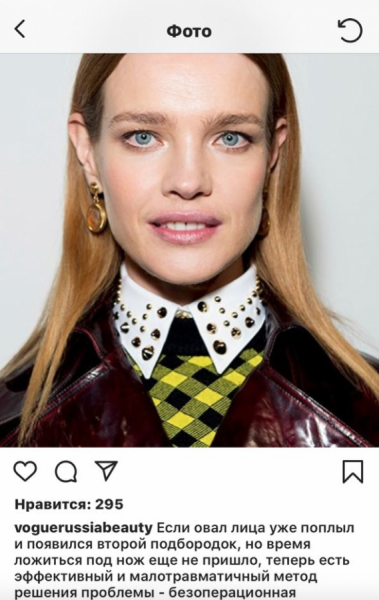 Неудачный снимок звезды сопровождал пост, анонсирующий статью журнала, с подписью: «Если овал лица уже поплыл и появился второй подбородок, но время ложиться под нож еще не пришло, теперь есть эффективный и малотравматичный метод решения проблемы — безоперационная подтяжка».
