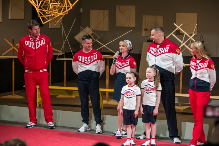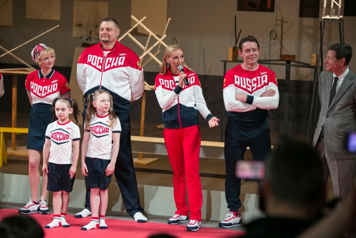 Презентовали новую форму олимпийские чемпионы: Светлана Хоркина, Татьяна Навка, Алексей Немов, а также главный тренер волейбольной сборной России Владимир Алекно и знаменитый хоккеист Павел Буре.