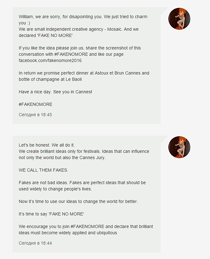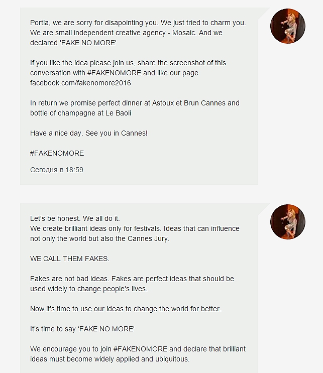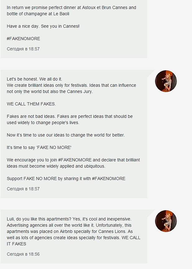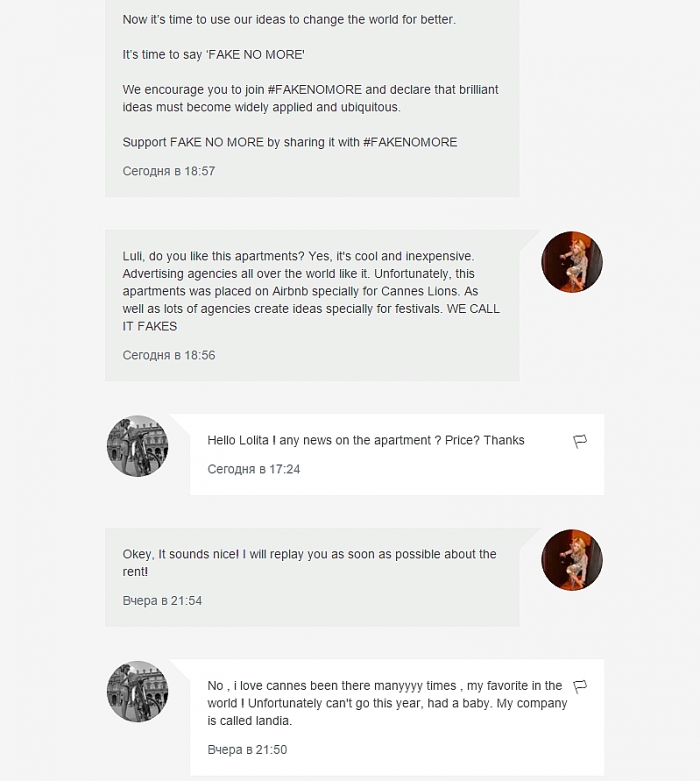 Сообщения с запросами стали приходить сразу после публикации информации о квартире. Когда заинтересованный пользователь из агентства или студии обращался к Mosaic с вопросами об апартаментах, он получал такое сообщение: «Рады, что вам понравилась квартира. К сожалению, это подделка, как и множество рекламных кампаний на самом фестивале. Поддержите наше движение хэштегом #fakenomore».