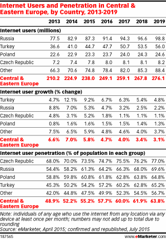 Что касается проникновение интернета, то оно продолжает неуклонно расти, хоть и не такими темпами, как смартфоны. В 2014 году, по данным eMarketer и SMG, более половины жителей региона выходили в интернет как минимум один раз в месяц, в 2015 году доля увеличится до 55%. В Польше и России проникновение интернета больше, чем в других странах региона, однако, оно по-прежнему отстает от западных стран.