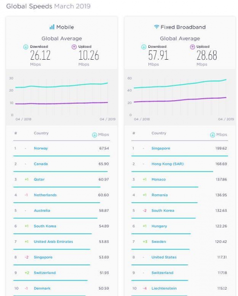 Скорость широкополосного доступа в интернет варьируется в зависимости от страны. Сервис и приложения SpeedTest — самый популярный способ определить реальную скорость соединения с интернетом внутри разных стран. Так, компания ежемесячно выпускает отчёт SpeedTest Global Index, который содержит эти данные.