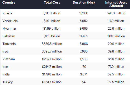 В глобальном масштабе, по данным Top10VPN, в 2025 году ограничения доступа к интернету фиксировались в 28 странах. Общая продолжительность интернет-шатдаунов в мире превысила 120 тыс. часов, а число затронутых пользователей приблизилось к 800 млн человек.