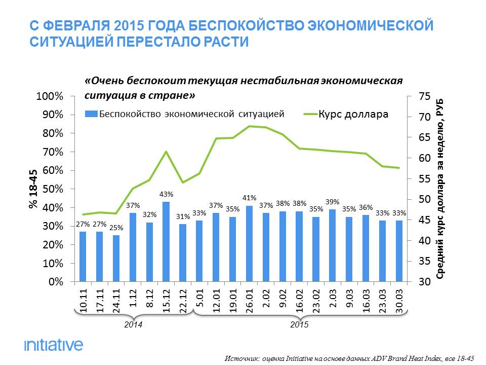 Если в декабре 2014 года беспокойство наших граждан достигло пика - 43% респондентов в возрасте 18–45 лет ответили положительно на утверждение: «Очень беспокоит текущая нестабильная экономическая ситуация в стране», то с февраля уровень беспокойства падает, и уже в марте количество таких респондентов снизилось до 33%.