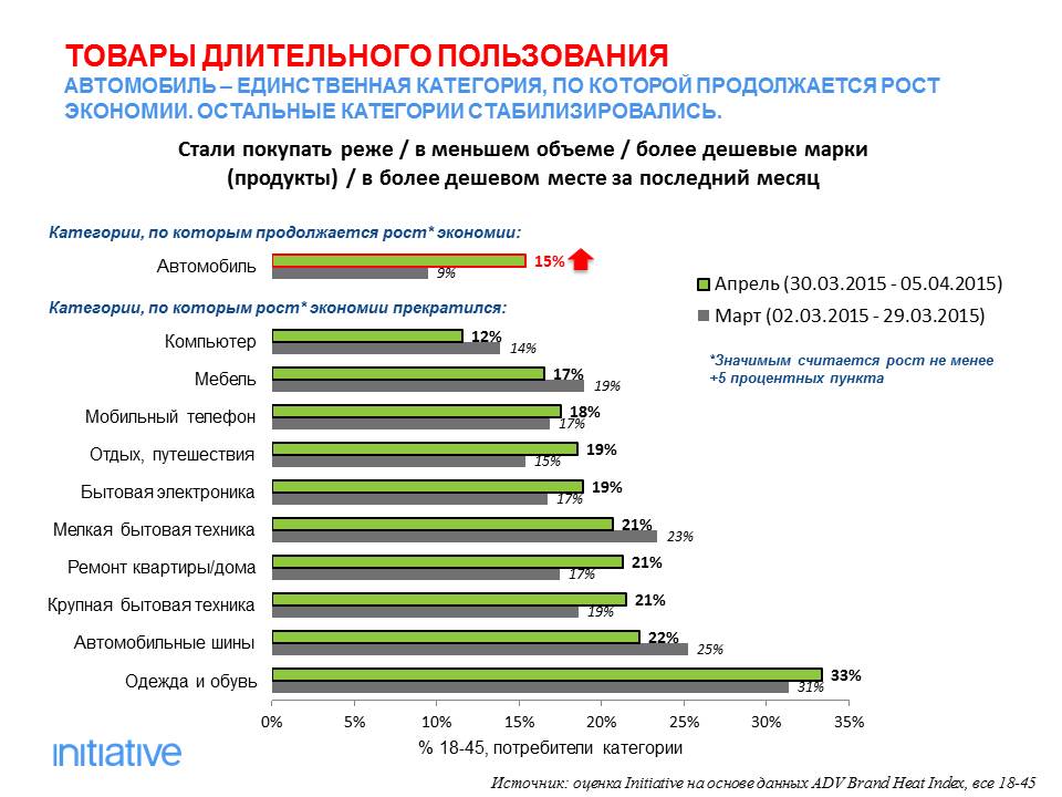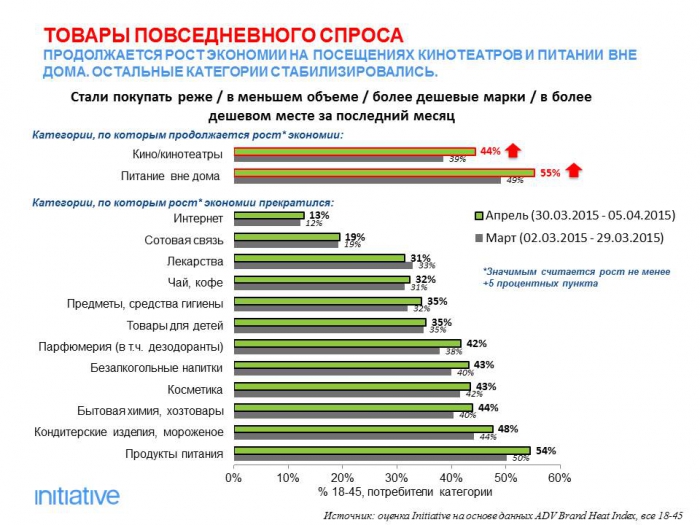 С конца марта 2015 года стабилизировалась ситуация и по категориям товаров. Но все еще растет число россиян, продолжающих экономить на автомобилях, походах в кинотеатры и питании вне дома. По остальным товарам ситуация восстанавливается. Это касается как товаров длительного пользования, так и повседневного. Например, уменьшился процент потребителей, которые экономили на покупках мебели, мелкой бытовой техники, компьютеров, лекарств.