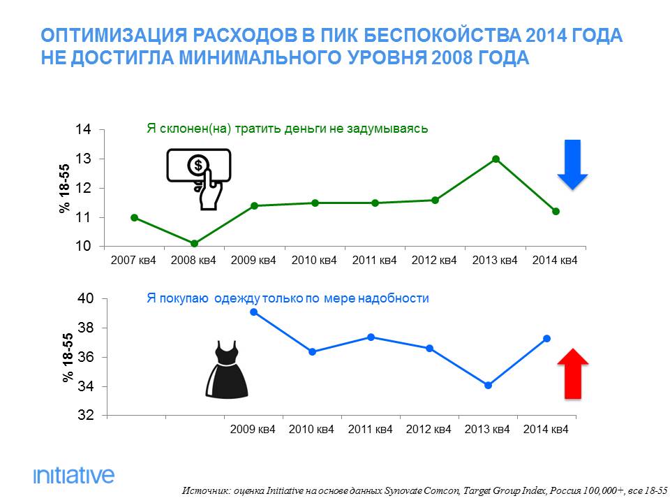 «Если сравнивать потребительское поведение россиян в кризис 2008 года и в сегодняшней экономической ситуации, то сейчас кризисные тенденции проявлялись в меньшей степени. Конечно, в данный период россияне пересматривают свое отношение к покупкам и начинают экономить, однако даже в пик беспокойства, который произошел в 2014 году, уровень оптимизации расходов не достиг минимального уровня 2008 года. Это может говорить о том, что россияне стали более уверенными в своем финансовом положении, чем в прошлый кризисный период», - отмечает Анна Яковлева, генеральный директор Initiative.