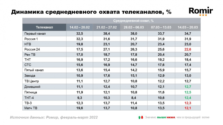Сократились охваты таких крупных телеканалов, как «Первый канал», «Россия 24», «Звезда». Ещё в конце февраля они пользовались повышенным интересом среди аудитории. Сейчас постепенно возвращается потребность к развлекательному контенту, увеличился среднедневной охват развлекательных телеканалов «Домашний», «Пятница» и «ТНТ- 4». Исключение составляют «ТВ-3» и «Матч ТВ» — их смотреть стали меньше.