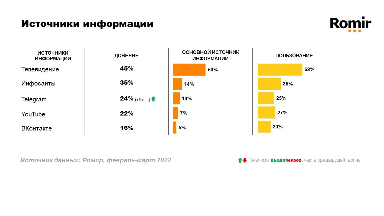 Основную информацию пользователи получают из телевизионных каналов (50% пользователей) и информационных сайтов (14% пользователей). Но также нельзя не отметить востребованность Telegram — за неделю доля интереса к нему выросла 6 п.п.