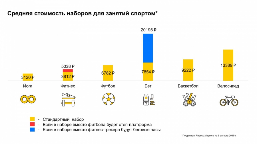 В компании подсчитали среднюю стоимость наборов для занятий разными видами спорта. Так, набор для тех, кто любит медитировать, включает в себя коврик (средняя цена 742 рубля), спортивную футболку (989 рублей) и леггинсы (1389 рублей). Средняя стоимость набора — 3120 рублей. Примерно на таком же уровне цен можно собрать набор для занятий фитнесом и пилатесом.