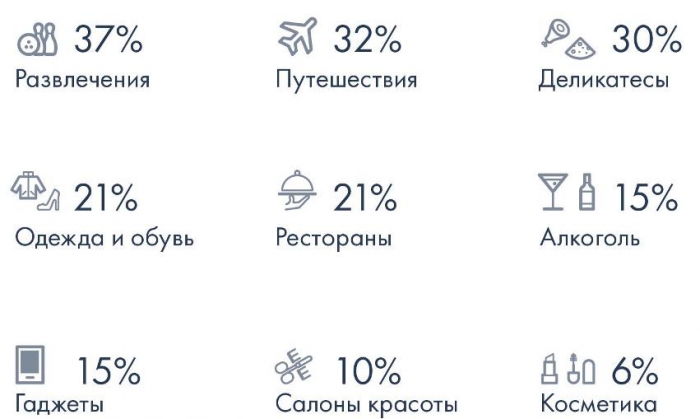 Как показали результаты опроса, первой статьей экономии россиян стали развлечения и путешествия. 37% наших соотечественников уже лишили себя новых эмоций, связанных с посещением новых мест и мероприятий внутри страны, а 32% - сократили свои расходы на туризм. Следом за развлечениями и путешествиями пострадали деликатесы (30%), одежда и обувь (21%), рестораны (21%), алкоголь и еда в целом (по 15%), а также гаджеты (15%).