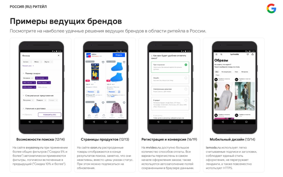В сфере ритейла Google проанализировал 24 самых популярных мобильных версии сайтов и отобрал пять из них, получившие наивысшие оценки. Это «Связной» (83%), «ЛитРес» (83%), DNS (80%), «Беру» (80%) и Asos (80%).