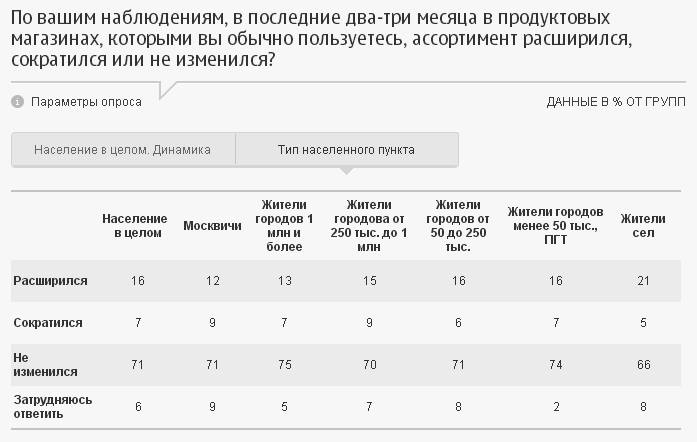 7% отметили сокращение ассортиментов. Большинство респондентов считает, что это связано с падением доходов населения и ростом цен. О росте цен на продукцию заявило 78% опрошенных. О снижении качества продуктов заявили 24% респондентов, 65% не заметили здесь изменений.