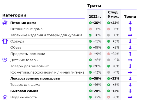 С точки зрения оценки трат за последние полгода респонденты уже отметили снижение расходов на предметы роскоши, путешествия, рестораны и электронику. При этом опрошенные заявили об увеличении расходов на ЖКХ, лекарственные препараты и медицинские услуги, продукты, связь и интернет, а также бытовую химию. Что касеется продуктов питания, то за последний год опрошенные увеличили траты на молочную продукцию (39% респондентов), свежие фрукты и овощи (36%), бакалею (34%), птицу (34%), яйца (33%) и мясную продукцию (33%) и сократили расходы на деликатесы и готовую еду (7%).