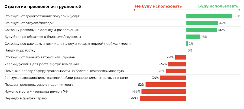 В 2022 году благосостояния российских потребителей ослабло, особенно в части долгосрочной стабильности, возможностей накоплений и самочувствия. Большинство респондентов считают, что на возврат к обычной жизни может уйти от года и более. Чтобы преодолеть трудности, граждане сокращают крупные траты, в том числе на дорогостоящие товары и услуги (60%), отпуска, путешествия, поездки (42%), одежду и развлечения (40%), следует из совместного исследования «Срез потребительских настроений в РФ № 1: новая реальность — 2022» компаний «Ромир» и «Яков и Партнёры», поступившего в Sostav.