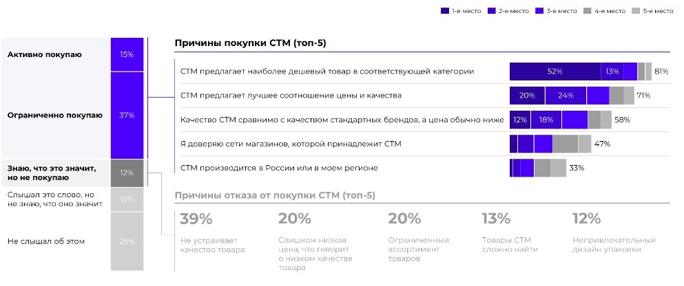 В большинстве своем потребители изменили набор брендов в продуктовой корзине: 39% из них — из-за роста цен, 33% — из-за ухода с рынка привычных брендов, а 21% — для тестирования отечественного производства. У потребителей с высоким доходом состав брендов изменился сильнее всего. Зумерам лучше всех удалось сохранить привычный состав корзины. Беби-бумеры переходят на отечественные марки охотнее, чем все остальные. При этом более половины респондентов перешли с брендов на СТМ.