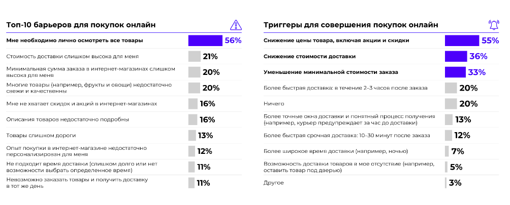 В целом одним из ключевых факторов выбора ритейлера стало удобство при совершении покупок: магазины у дома лидируют по частоте покупок (62% респондентов посещают их два-три раза в неделю и чаще). С точки зрения каналов продаж 68% респондентов по-прежнему предпочитают совершать покупки в офлайн-канале, а четверть отметили, что их покупки разделились примерно поровну. Для 56% опрошенных важен физический опыт при выборе товара. При этом триггером для перехода в онлайн может стать более выгодное ценовое предложение, снижение стоимости доставки, а также уменьшение минимальной стоимости заказа.
