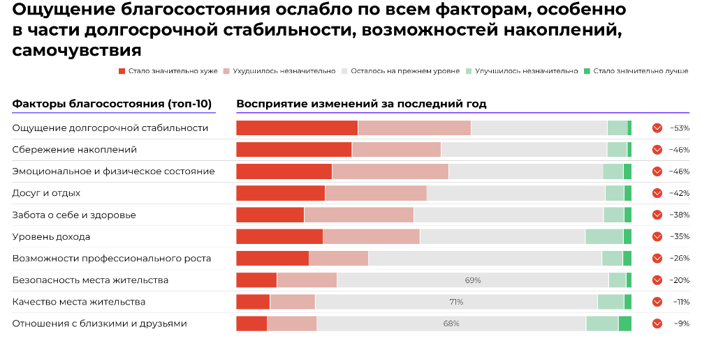 Несмотря на заметное ухудшение всех факторов восприятия благосостояния (включая доходы, здоровье, профессиональное развитие, безопасность, досуг и отдых, заботу о себе, качество жилья), ряд потребителей, особенно молодое поколение, проявил устойчивость к изменениям. Молодежь и покупатели с высоким доходом ожидают некоторого улучшения благосостояния семьи в ближайшие полгода. При этом опрошенные всех категорий дают более позитивный прогноз относительно благосостояния семьи по сравнению со своим местом работы или страной в целом, что говорит о росте семейных ценностей и соответствующей корректировке потребительских предпочтений.