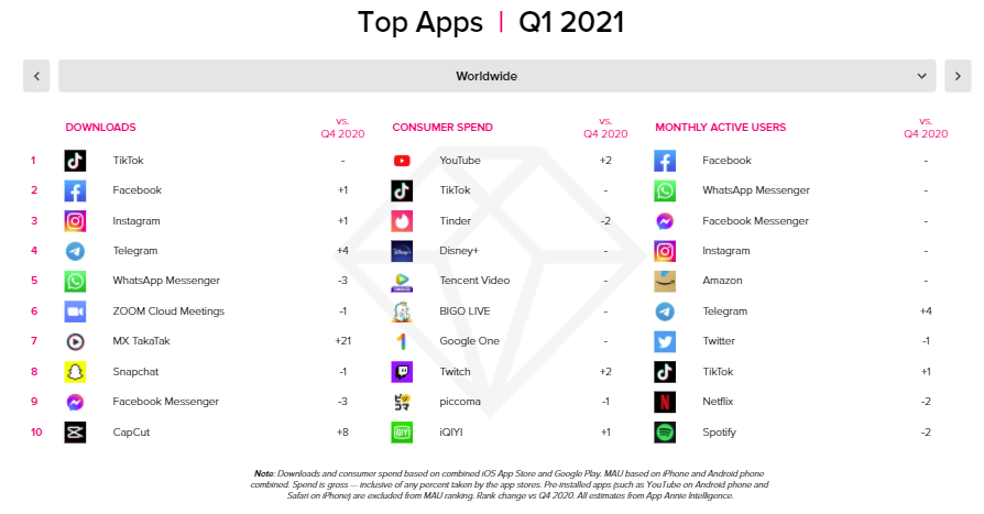 Число загрузок приложений в мире увеличилось за квартал на 10%, в России — на 5%. В тройку мировых лидеров по количеству загрузок в первом квартале 2021 вошли социальные сети TikTok, Facebook и Instagram. Больше всего денег пользователи потратили в приложении Youtube, второе место занял TikTok, а замыкает тройку Tinder.