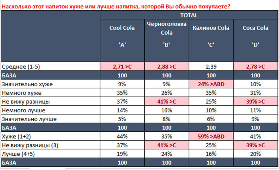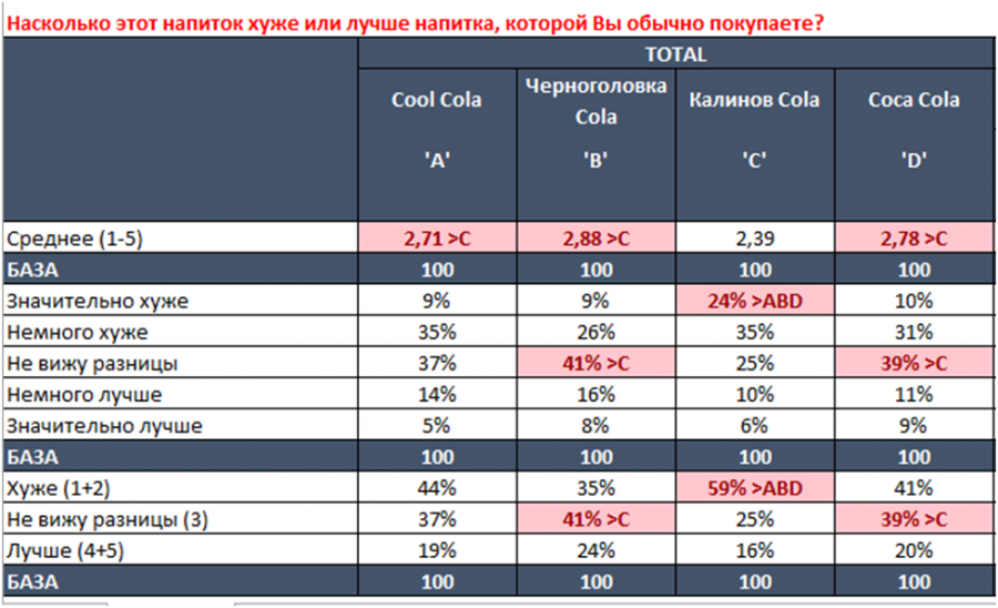 В «слепом» тестировании приняли участие более 100 респондентов в возрасте от 18 до 25 лет — основная целевая группа данной категории напитков. Участники исследования сравнивали газировку российского производства: Cool Cola («Очаково»), «Кола Черноголовка», «Калинов Cola» с оригинальной Coca-Cola.
