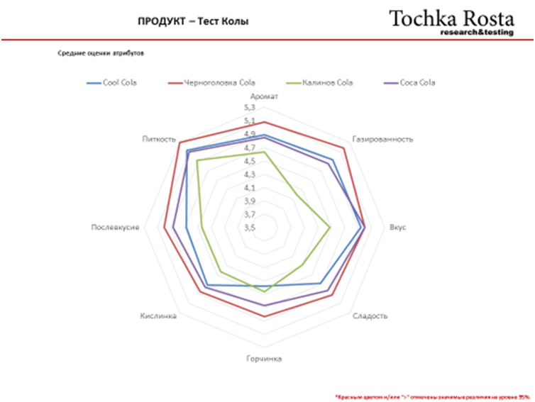 Сильнее всех от оригинала отличается «Калинов Cola», следует из данных опроса. Потребители отметили излишнюю кислинку и сладость, а также выраженное послевкусие. Также напиток отличается от конкурентов по цене и соответствию оригиналу, а также ряду других характеристик.
