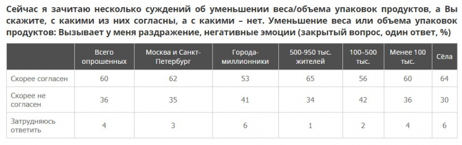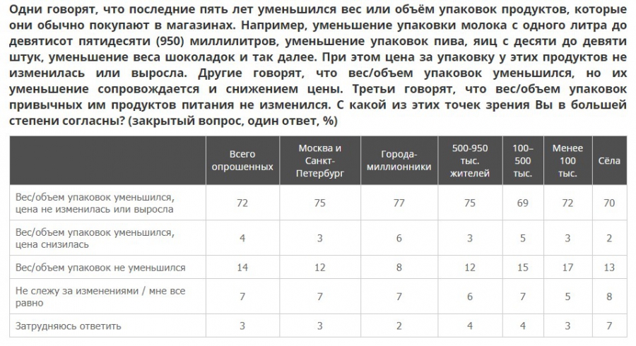 Эту точку зрения поддержали 65% опрошенных. Изменение объема и веса упаковок при одновременном подъеме цен заметили 72% наших сограждан. Особенно на это обратили внимание жители городов-миллионников. Еще 14% считают, что ничего не изменилось.