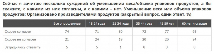 Большинство опрошенных уверены, что уменьшение упаковки является следствием «заговора производителей». Особенно склонны поддерживать это мнение молодые люди в возрасте от 25 до 34 лет, таких 80%. 38% увидели инициаторами этих изменений магазины или же торговые сети.