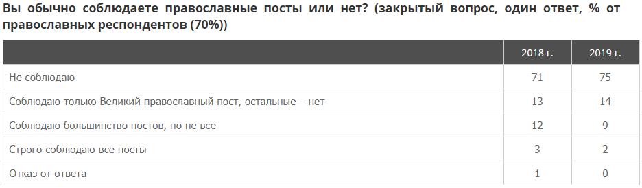 Согласно опросу ВЦИОМ, около четверти россиян соблюдает посты с той или иной периодичностью. При этом, 14% ограничиваются лишь Великим постом, 9% соблюдают большинство из них, а 2% строго следуют правилам и каждому посту, сообщает ВЦИОМ.