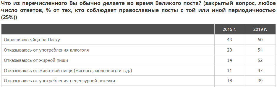 Наиболее распространенным проявлением религиозности, связанным с постами, является окраска яиц на Пасху. Эти занимаются 60% опрошенных. Значительно больше стало тех, кто отказывается от алкоголя на время Великого поста. Для сравнения, в 2015 году таких было всего 20%, а к 2019 их уже 54%.