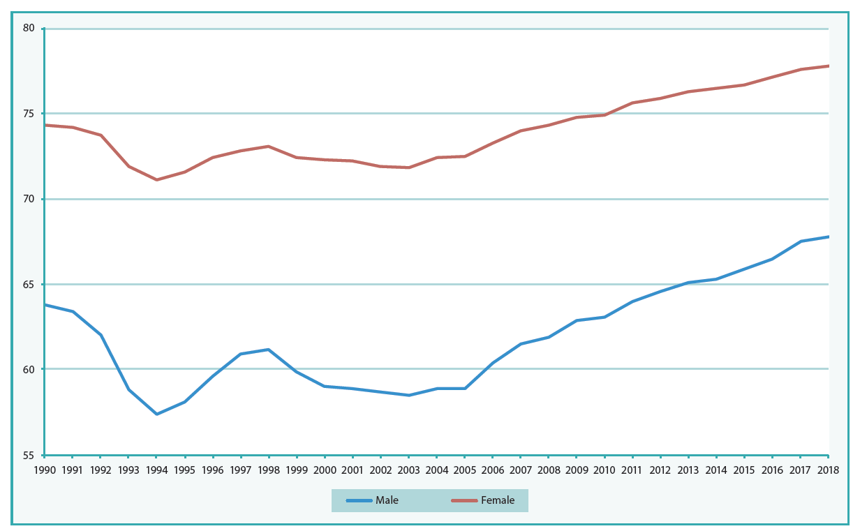 Средняя продолжительность жизни в России мужчин (синяя линия) и женщин (красная линия), лет