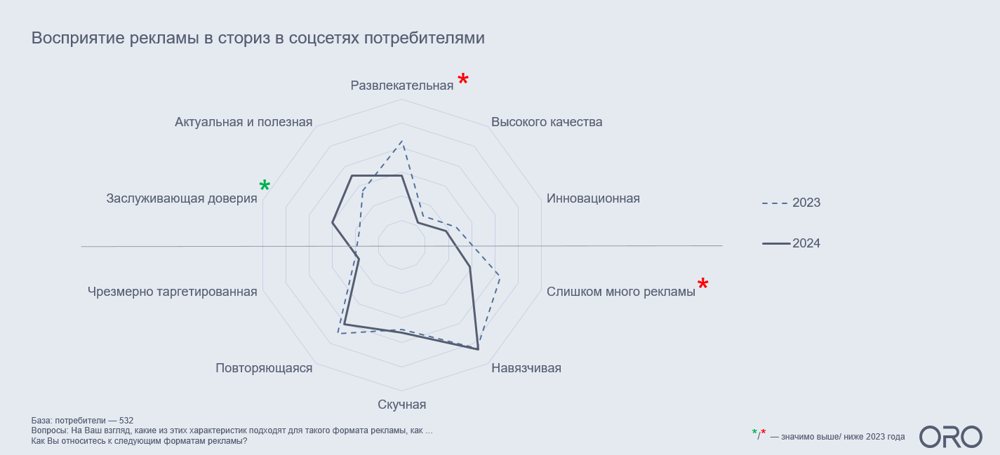 Реклама в сторис больше не кажется россиянам такой уж развлекательной — за год показатель заметно просел. Зато повысилось доверие: все больше людей воспринимают прямые сообщения от брендов как полезные и заслуживающие внимания. Кроме того, ушло ощущение перегруженности — реклама меньше раздражает пользователей и не утомляет как раньше.