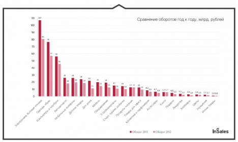 Наибольший рост показали сегменты товаров для дома и зоотовары – 97% и 95%, соответственно. Самыми популярными категориями товара по обороту в 2013 году стали: «Электроника и бытовая техника» (107 млрд рублей), «Одежда, обувь» (76 млрд рублей), «Компьютеры, ноутбуки, комплектующие» (56 млрд рублей), «Автозапчасти» (26 млрд рублей) и «Мобильные телефоны» (26 млрд рублей).