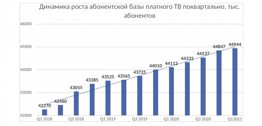 Сейчас возможности для роста рынка платного ТВ почти исчерпаны. Если в 2020 году спрос на платное ТВ стимулировала самоизоляция граждан, то в 2021 году рынок близок к насыщению. Проникновение платного ТВ в России уже составляет 81%.