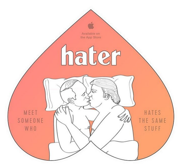 Hater – это приложение для знакомств, которое подбирает партнера на почве ненависти к разным вещам. По интерфейсу оно работает как Tinder – пользователю предлагается свайпать влево, вправо, вниз и вверх. При этом вместо партнера предлагается оценивать предметы, темы и людей.