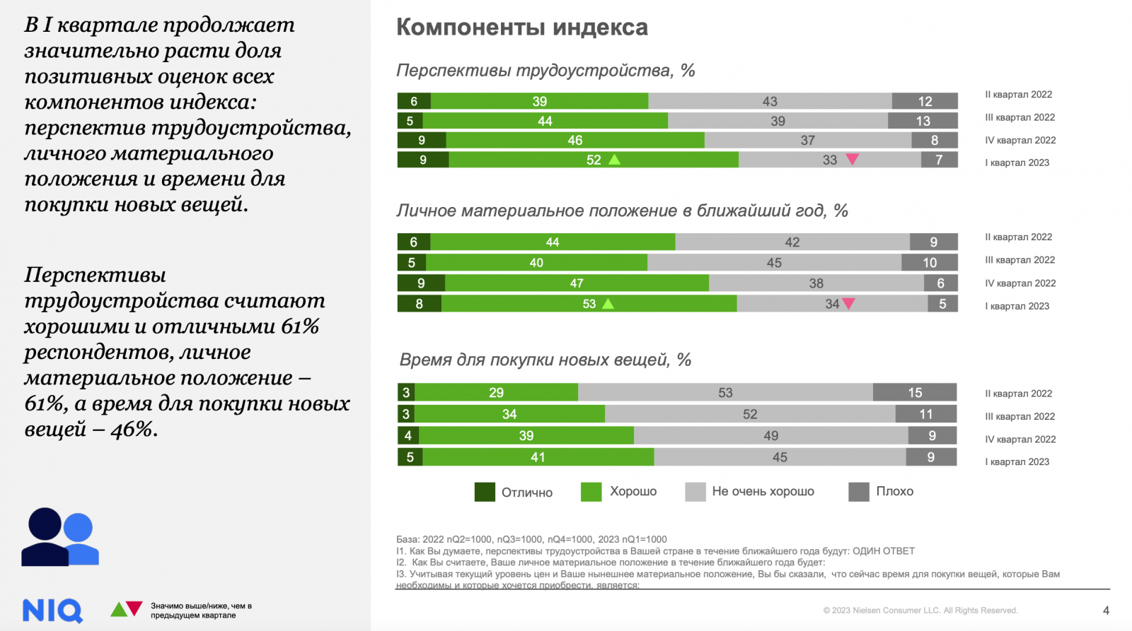 По данным NielsenIQ, в первом квартале 2023-го доля позитивных оценок выросла во всех трёх ключевых компонентах индекса: перспективах трудоустройства (61% опрошенных потребителей оценивают их как отличные и хорошие, рост на 6 п.п.), личном материальном положении (61%, рост на 5 п.п.) и готовности к покупке новых вещей (46%, рост на 3 п.п.).