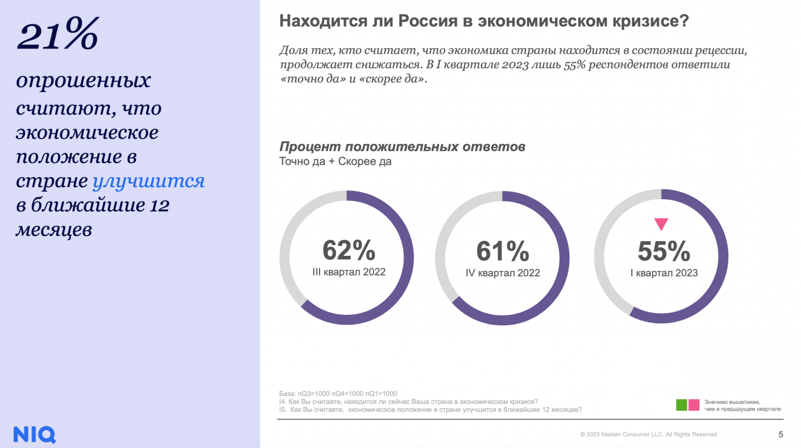В первом квартале значительно сократилось число тех, кто считает, что экономика страны находится в кризисе. Если раньше об этом говорили 7 из 10 респондентов, то к началу 2023 года этот показатель снизился до 55%. Более того, пятая часть потребителей (21%) считают, что в ближайшие 12 месяцев экономическое положение в стране улучшится.
