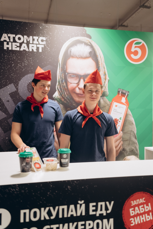- Перед выходом игры и стартом розыгрыша состоялся тизер кампании — топовые стримеры Twitch проходили первую часть игры Atomic Heart, где в специально подготовленных внутриигровых роликах Баба Зина рекламировала готовую еду из «Пятёрочки», а курьеры доставляли еду прямо на стримы в момент рекламы.