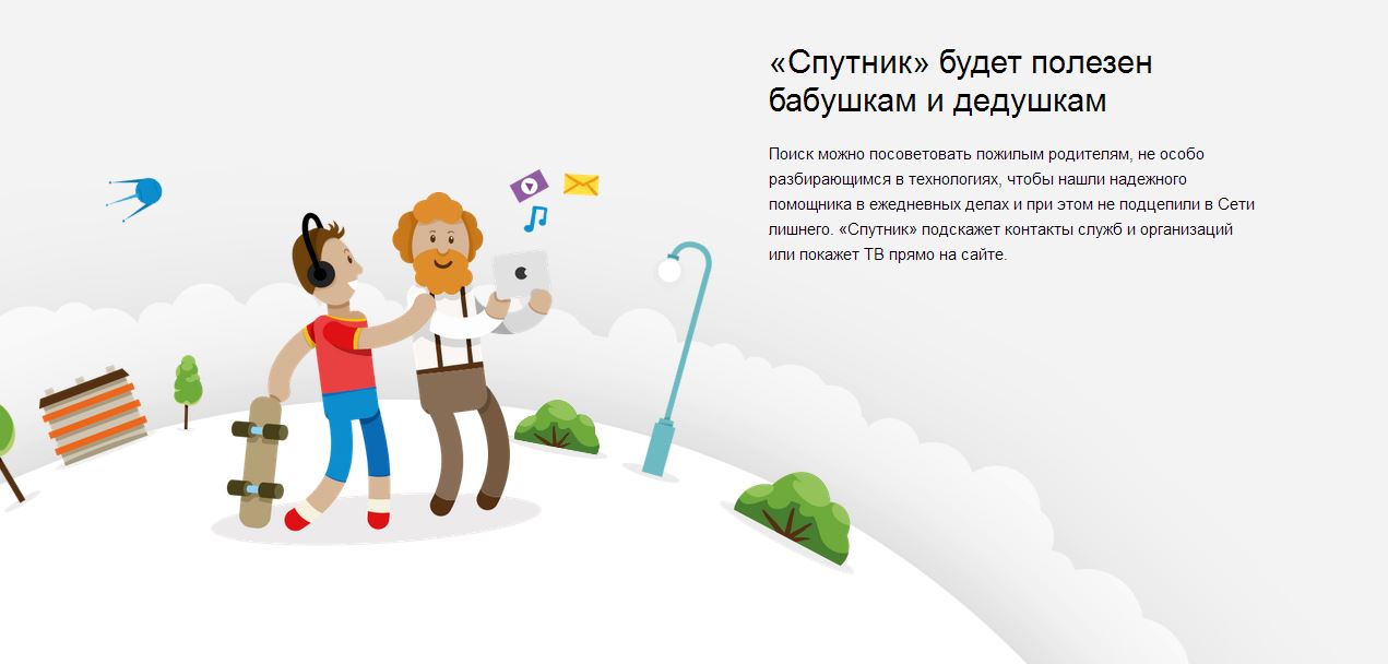 Сервисы «Спутника» призваны помочь в повседневной жизни: подсказать аптеку с нужным лекарством, автозаправку с самой выгодной ценой, ближайшую ветеринарную клинику. Кроме того, поисковик покажет новости дня и ряд телеканалов прямо на сайте. На данный момент «Спутник» проиндексировал более 10 млрд документов Рунета.