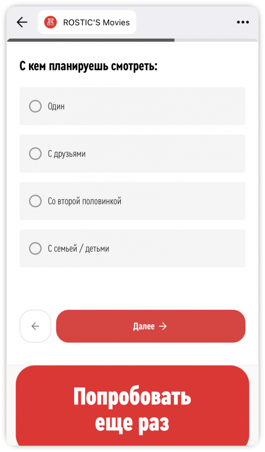 Внутреннее исследование продуктов в Telegram показало, что Mini App со списком фильмов и AI-помощником пока нет на рынке. При этом формат ложился на позиционирование бренда: ROSTIC’S акцентирует внимание на моментах удовольствия, которые приятно разделить с семьей и друзьями, а также на том, что горячая закуска — идеальный спутник киновечера.